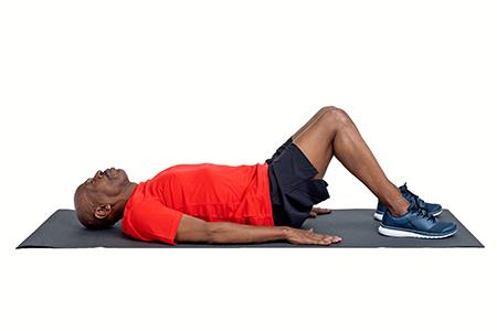 Put both your hands on one knee and pull your thigh against your stomach. Then stretch out your opposite leg keeping your heel on the ground.