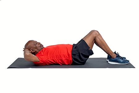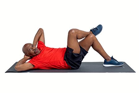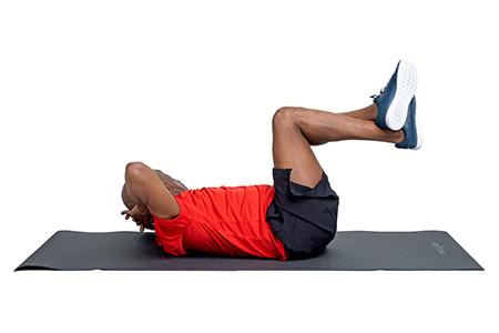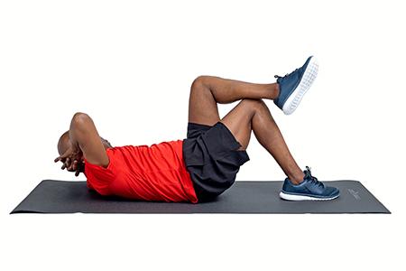 Put both hands behind the back of your neck. Lift your shoulder directing the elbow to the opposite knee.