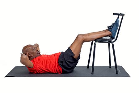 Put both heels on the floor, then lift both shoulders and lower them slowly. Look up towards the ceiling whilst performing this exercise.