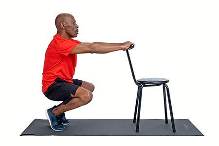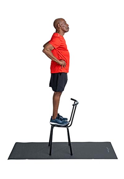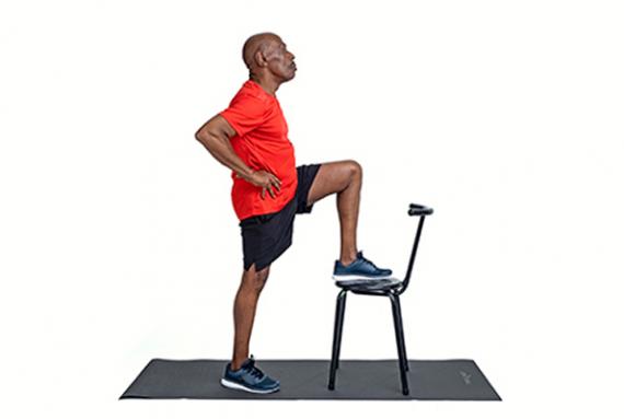 Start with one foot flat on the chair then step up, bringing your other foot onto the chair. Stretch out your leg and get down again slowly. Do the same on the other leg.