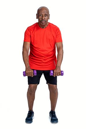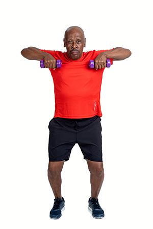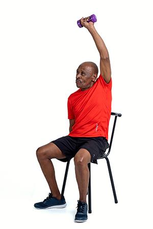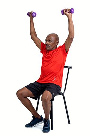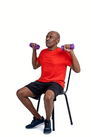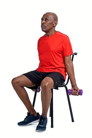 Sit on the chair and start with your arms extended along your body. Bend your elbow to bring your arms up towards the body. Release your arms back down alongside your body, slowly.