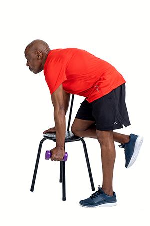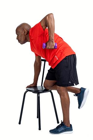With one knee and one hand on the chair, keep your back flat and pull the load vertically whilst keeping your elbow along your body.