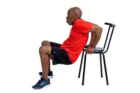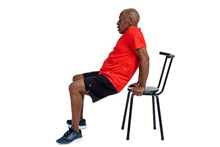 Place both hands on the chair so you are facing away from it. Bend then stretch out your arms keeping your back near the seat of the chair. Breathe out while lifting.